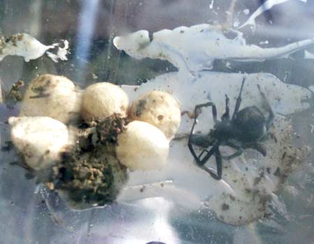 החוקרות, פרופ' יעל לובין, רותי אריאלי ומיכל סגולי, בדקו את העכבישים ממין האלמנה החומה - Latrodectus geometricus - להם הרגלי מין מעניינים במיוחד: הזכר הזכר מחזר אחרי הנקבה על-ידי כך שהוא יוצר ויברציות על קורי המשי שלה, חותך קורים ומוסיף קורים משלו. לאחר כשעה של חיזור נמרץ הנקבה נענית לו. אז מבצע הזכר פעולה מפתיעה: הוא מרים את בטנו עד שזו נוגעת בגפי הפה של הנקבה, פעולה המעודדת את הנקבה להתחיל לאכול אותו. זכר שמשתחרר מן הנקבה ימשיך לחזר אחריה עד שיגיע שוב לעמדת הזדווגות ויבצע את ה"היפוך" בפעם השנייה. בשלב הזה בדרך כלל הנקבה עוטפת את הזכר בקורים ואוכלת אותו לגמרי, או משאירה אותו למות בין הקורים.