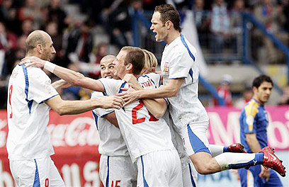 שחקני הולנד חוגגים. נקודות יקרות בחוץ (צילום: איי פי)