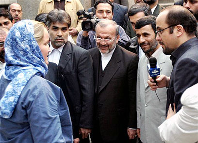 החיילת הבריטית פיי טרני עם נשיא איראן ושר החוץ מותאקי (צילום: איי.פי)