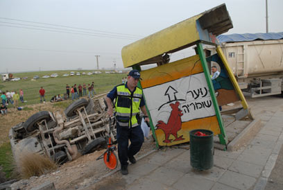רב פקד רחביה עומסי, ראש לשכת התנועה במרחב נגב, אמר ל-ynet: "המשאית המשיכה לתעלה שבצד הדרך, וכתוצאה מכך נפצעו הנהג ונוסע נוסף שהיה עימו. המשאית התהפכה והחצץ שהובילה התפזר". נהג המשאית והנוסע שהיה עמו, בני 26 ו-23 מלקיה, הובהלו לבית החולים סורוקה ושוחררו לאחר שקיבלו טיפול רפואי.