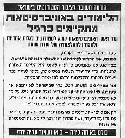 במקביל, ועד ראשי האוניברסיטאות פירסם היום מודעות בכל העיתונים הקוראות לסטודנטים לשוב לספסל הלימודים. "כמוכם, אנו חרדים לעתידה של ההשכלה הגבוהה בישראל", פונה הוועד לסטודנטים, "אנו מאמינים כי ועדת שוחט היא הסיכוי האחרון להצלתה. כדי שהוועדה תצליח במשימתה, עלינו לשתף פעולה עמה. חרמות והתעלמות יגרמו לתוצאות הרסניות.