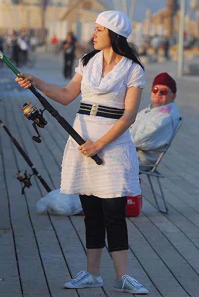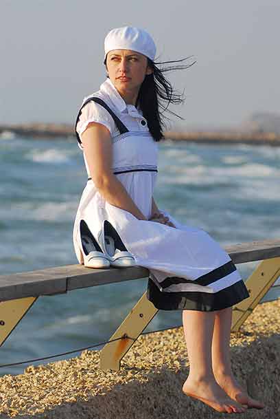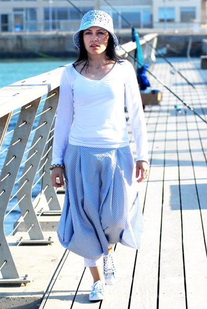 ביגוד: חצאית מכנס תכלת עם פסים - פראו בלאו, רחוב החשמל 8 תל אביב. חצאית לבנה, חגורה כחול-זהב -כתומנטה, דיזינגוף 173 תל אביב. נעלי עקב לבנות, שמלה לבנה, חולצה לבנה עם כפתור, מכנסי ג'ינס, חולצת טריקו ארוכה לבנה - זארה, קניון רמת אביב. סניקרס כסופות, שמלת סטרפלס ג'ינס, סוודרון שמנת - פול אנד בר, קניון רמת אביב.