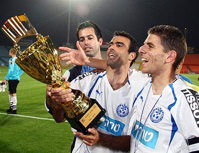 איל טרטצקי וכפיר אדרי עם הגביע של הרצליה (צילום: אלי אלגרט)