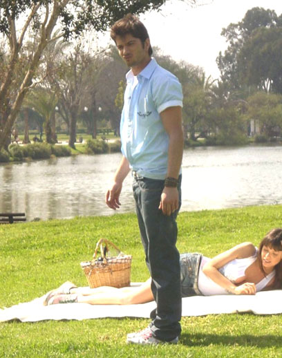 על הדשא של פארק הירקון הוא נאלץ להתמודד עם תסריט שכלל פיצוצים של כדורגל הישר לפרצופו היפה. את אופציית הכפיל הוא דחה והתעקש לבצע את הצילומים בעצמו מול עיניה של הפרטנרית ניבית בש. ניבית הפנימה את ההקרבה ותרמה כמה ימים אחר כך את גופה החטוב לטובת צילומים רטובים במיוחד.