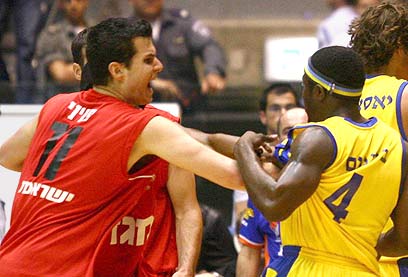 פניני מושך בחולצה של מצטיין המשחק, וויל ביינום (צילום: אלי אלגרט)