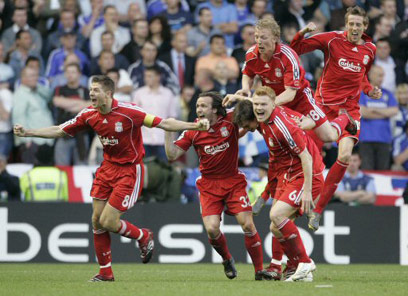 שחקני ליברפול חוגגים את הכרטיס לאתונה (איי פי)