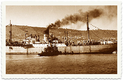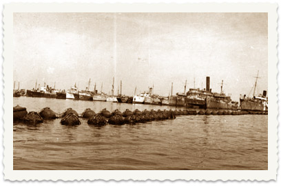 ליד שובר הגלים בנמל חיפה שכנו כל אוניות המעפילים שתפסו הבריטים, מוקפות בשרשרת מוקשים. מיד עם העברת הנמל החלו אנשי הפלי"ם להכשיר את האוניות לצי העברי הראשון.