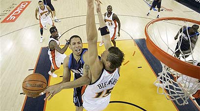 אנדריס ביידרינס לא נותן לדווין האריס לקלוע סל קל, הבוקר (צילום: איי פי)