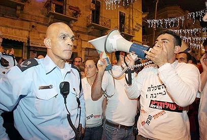 מפקד המחוז ואחד המפגינים (צילום: חיים צח)