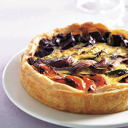 6. מקמחים קלות משטח עבודה, ופורשים עליו את הבצק. מחלקים את הבצק לשניים ומרדדים לשני עיגולים בקוטר 30 ס"מ ובעובי 0.4 ס"מ. משמנים את שתי התבניות, מרפדים אותן בבצק ומהדקים היטב. מסדרים את הירקות בתערובת צבעונית על גבי הבצק ויוצקים מעל הירקות את הרוטב. אופים כחצי שעה, עד להזהבה. מגישים חם.