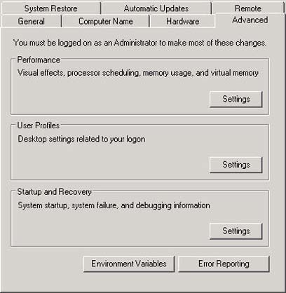 אם הבעיה אינה מקום אחסון, אולי ההגדרות של הזיכרון הוירטואלי אינן נכונות. הקליקו עם הכפתור הימני על My Computer ובחרו באפשרות מאפיינים (Properties). הקליקו על לשונית מתקדם (Advanced). לחצו על כפתור "הגדרות" (Settings) שנמצא תחת האפשרות "ביצועים" (Performance). אז, בחרו בלשונית מתקדם (Advanced) בתוך תיבת הדו-שיח, הקליקו על כפתור "שינוי" (Change) שנמצא תחת ההגדרות של "זיכרון וירטואלי" (Virtual Memory).