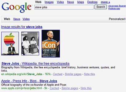 למשל, חיפוש אחר שמו של מנכ"ל אפל, סטיב ג'ובס, יוביל לדף שבראשו תמונותיו של ג'ובס ותוצאות לספרים המזכירים אותו, ובהמשך קטעים אחרונות מבלוגים בנושא ג'ובס וקישורים לקטעי וידאו שהקלקה עליהם פותחת את נגן הווידאו של YouTube בתוך הדף. לחיצה על Play תנגן מיד את הווידאו.