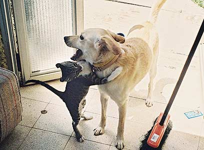 הכלבה ואחת החתולות בפוזה אופיינית (החתולה השנייה היא סרבנית צילום)