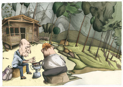 את השקשוקה שלנו, יותר מ־20 שנה אחרי הפעם האחרונה שטיילנו ביחד, אנחנו מכינים ליד בית היערן. בשנות ה־50 זה היה ביתו של יוסוף ספדי, דרוזי ממג'דל שאמס שהקים בסוריה רשת ריגול ישראלית. הרשת נחשפה, וספדי נמלט לישראל. הוא מצא מקלט בבית ג'אן ועבודה כשומר יערות עם בית בטבע, סידור שהיה בו גם פיצוי מסוים. אין הרבה בתים כאלה — בטח שלא היו אז — והסורים, שרק חיכו להזדמנות לנקום בספדי, לא התקשו לאתר אותו. עלי חרבוש, פליט מכפרי הגליל שחי בלבנון, נשלח לבצע את המשימה. ספדי נרצח כשהוא חובק תינוק בן שלושה חודשים. חרבוש המשיך להיכנס ולבוא אל הארץ שממנה נעקר עד שעלה על מארב ליד חורבות חממה, גם הן בגבולות שמורת מירון. ההפי־אנד בסיפור הזה שמור כמובן לתינוק: הוא ילד גדול, עוסק במחשבים, וחזר לגור במקום שממנו יצא אביו, במג'דל שאמס.