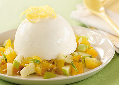 חצי כדור קפוא של קציפת מסקרפונה, יוגורט ולימון עדינה. מוגש על סלט פירות, מבושם בעלי נענע קצוצים.