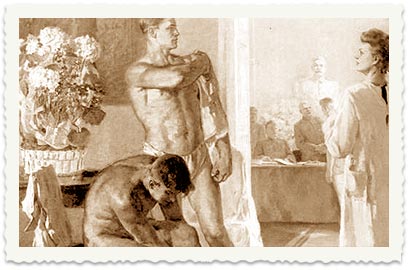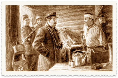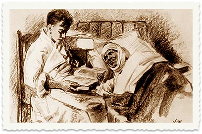 חניך של הפיוניר (ארגון צעירים בברה"מ) מבקר פצוע ממגיני סטלינגרד