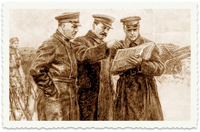 סטאלין, מרשל קלימט וורושילוב ומרשל קונסטנטין רוקוסובסקי בקו החזית