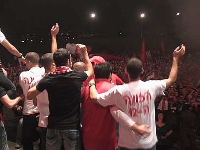 אוהדי הפועל בגני יהושע עם החולצה מעוררת המחלוקת (צילום: יועד כהן)