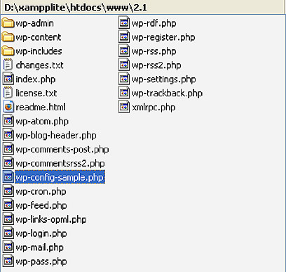 על מנת שנוכל להתקין את Wordpress צריך לשנות בה קובץ אחד, לפני שמעלים את הכל לשרת, וזאת על מנת שתהיה למערכת גישה למסד הנתונים שלכם שם יישמרו הפוסטים וכל המידע על הבלוג. ניכנס לתיקיה שלתוכה חילצנו את קובץ ה-Zip, ונראה מספר קבצים ותיקיות: