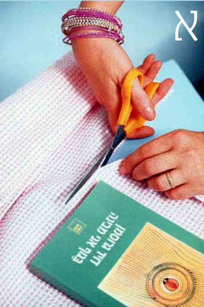 א.מדדו את רוחב הספר, הכפילו בשניים והוסיפו לתוצאה שהתקבלה עוד 10 ס"מ. עכשיו אתם יודעים כמה בד אתם צריכים. הניחו את הספר לאורכו של הבד, השאירו 2 ס"מ מלמעלה ומלמטה למכפלת, וגזרו במספריים את האורך הנדרש.