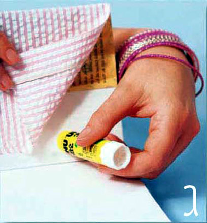 ג. ומכאן, למלאכת העטיפה: מניחים שוב את הספר במרכז הבד לאורכו, עוטפים אותו בבד ומכניסים את השאריות שנותרו לחלק הפנימי של הכריכה. מרימים את הכריכה הקדמית, כך שהכריכה תעמוד בזווית של 90 מעלות לספר. מורחים את הדבק לאורך הכריכה ומדביקים את הבד. הופכים את הספר לצד השני וחוזרים על הפעולה.