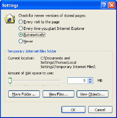 לחיצה על כפתור Settings (הגדרות) שבמרכז החלון תביא אותנו לחלון בו ניתן לקבוע את גודל תיקיית ה-cache. אם המספר עומד על מאות או אלפים, כדאי למחוק אותו ולהקליד במקום מספר נמוך מ-100 מגה. 5 מגה יספיקו. את המקום הנוסף בדיסק הקשיח שהרווחתם אפשר לנצל למטרות נעלות יותר.