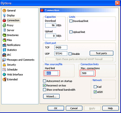 במקרה שאימיול גורמת לניתוקים החוזרים והנשנים, יש פתרון אחר. ניתן להנמיך את מספר ההתקשרויות שהתוכנה מנהלת ולהקל על רכיבי הרשת. לשם כך, יש להיכנס ל-Options (אפשרויות) בחלק העליון של החלון ולעבור ל-Connection (התקשרות). בחלון שלפניכם יש לטפל בשדות hard limit ו-max connections (חיבורים מקסימליים).
