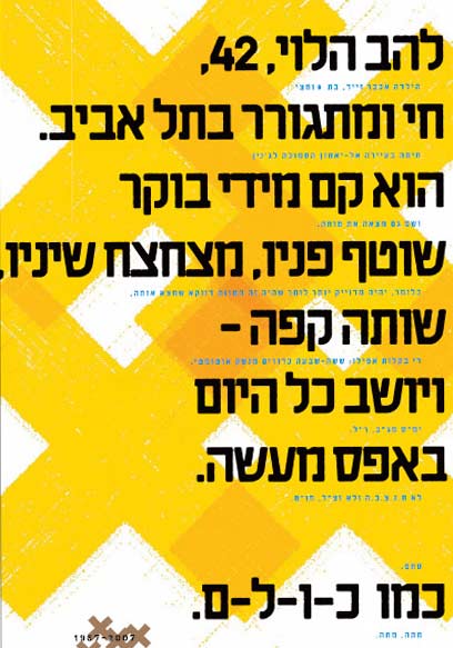 כמו תמרור נחרץ וברור בתוך הבליל הדביק והזחוח של הנוסטלגיה, תפתח השבוע בבניין בתהליכי שיפוץ, ברחוב רוטשילד בתל אביב תערוכה מרובעת שבה יציגו שני מעצבים, צלם ועיתונאי 40 עבודות לציון 40 שנות כיבוש. הצלם מיקי קרצמן מציג צילומים שצולמו בשטחים הכבושים, המעצב דוד טרטקובר מציג עיבודים מחודשים לכרזות, העיתונאי גדעון לוי מציג טקסט העומד כיצירה בפני עצמה והמעצב להב הלוי, הרוח החיה מאחורי התערוכה, מציג כרזות שנעשו בשבועות האחרונים כתגובה למתרחש בשטחים.