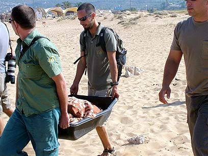 פוצקר מועברת בתוך גיגית אל הים (צילומים: אחיה ראב"ד)