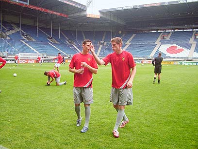 שחקני נבחרת בלגיה מתרגלים לדשא בהירנביין (צילום: עודד שלו)
