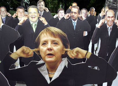פוסטר של 27 מנהיגי המדינות בהפגנה נגד הפסגה (צילום: AP)
