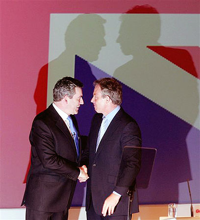 בלייר ובראון, היום במנצ'סטר. מעבירים את השרביט (צילום: AP)