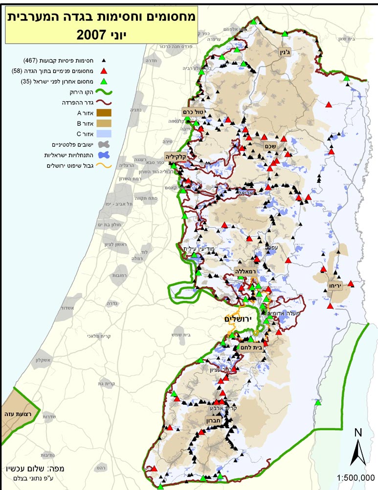 מדו"ח "שלום עכשיו" עולה כי ברחבי יהודה ושומרון יש 93 מחסומים מאוישים ו-467 חסימות קבע - כגון חסימות עפר, שער, בלוקים ותעלות. עוד טוענים בתנועה כי מתוך המחסומים המאוישים 35 מוצבים על הקו הירוק, 43 במקומות אחרים בגדה, שלא על הקו הירוק ו-15 מחסומים נמצאים בחברון וסביבותיה. מזכ"ל "שלום עכשיו", יריב אופנהיימר, אמר ל-ynet כי "חלק מהמחסומים מייצרים טרור ולא מונעים אותו. אנשים עומדים שעות בחום והדבר פוגע בחייהם".