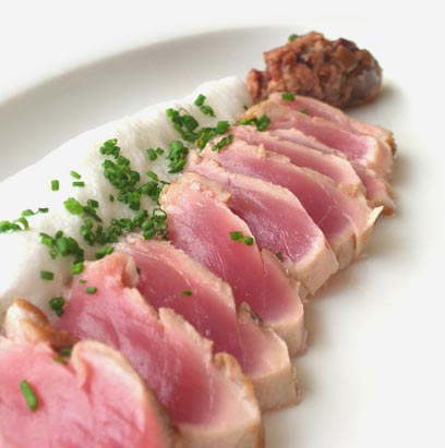 טונה צרובה עם תפוחי אדמה מוקצפים וטפנד (צילום: רני אריאלי)