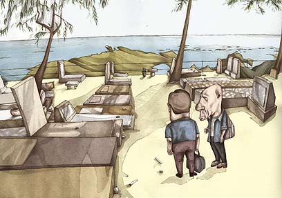 השביל חוצה את המושבה, מתעקל, מגיע אל כביש טבריה־צמח ונכנס לבית הקברות של כנרת. אני לא יודע איזה בית קברות ישראלי הוא השני ביופיו ובעניין שבו, אבל אין ספק שזה של כנרת הוא הראשון ברשימה. בזלת שחורה נושקת למים כחולים, עצי דקל גבוהים והיסטוריה ציבורית ופרטית בין האבנים. טמונים כאן גדולי האומה: מייסדי תנועת העבודה, חלוץ שדעתו נטרפה, אחר שספג בעיטת פרדה — וכמובן, קברה הקסום של רחל המשוררת וזה החדש של נעמי שמר.