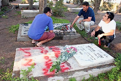 אוהדי הפועל ת"א הניחו פרחים על הקברים המושחתים (צילום: אבי מועלם)