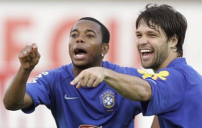 רוביניו ודייגו באימון המסכם של ברזיל. אווירה טובה ב'סלסאו' (צילום: איי פי)
