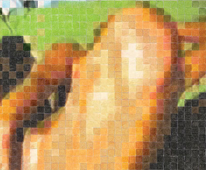 שמונים וששה הפריימים בספר טופלו על ידי גילרמן, כל אחד בנפרד, באמצעות תוכנה שמעבדת תמונות לדגמי גובלן. במקום לרקום גובלן היא צבעה את ריבועי הפיקסלים שנוצרו בצבעי עיפרון, בשלושים גוונים שונים, והשתמשה בהם אחר כך כמרכיבי הדימויים. כל אחד מעמודי הספר בנפרד נראה מפורק לריבועי צבע ובכל זאת, בתוך הרצף הוא מובחן לדימוי שלם. דמותה של האשה מתהווה בהדרגה ולעולם לא תגיע לכלל זיהוי מובחן. דרך מחוות הגוף הנוצרת בעילעול, תנועת הראש והצוואר, היא הופכת להיות כל אשה.
