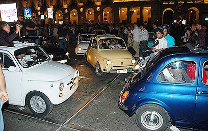 לאחר המופע, בו צפו מי שלא זכה להיכנס לטריבונות ממסכי ענק שניצבו בשלל כיכרות בעיר, התקבצו 500 מכוניות מדגם ה-500 הישן בכיכר המרכזית, בחגיגה רעשנית במיוחד של מנועים, צפצפות, דגלי איטליה, צופרים ו...עוד צפצפות. האיטלקים לא מאמינים בהדחקת רגשות - במיוחד לא שמחה. החגיגה הרעשנית הזו הסתובבה למחרת בעיר, לשמחתם של התושבים (העיר כולה נראתה כמי שלקחה חופש לצורך האירוע). דמיינו לעצמכם עשרות פיאט 500 זערוריות נעות לכאן ולשם בזריזות, מתקבצות לשיירות, ממלאות חניונים וחוזרות שוב לכביש בטרטור גדול.