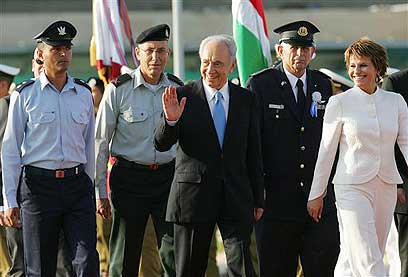 בסקירת משמר הכבוד. הנשיא פרס והנשיאה בפועל איציק (צילום: AP)