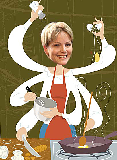 מה אני עושה בבית: הממלכה שלי זו הכביסה. לא נותנת שיגעו לי בה ובמכונת הכביסה, וגם לא בחדר הארונות. אני מזמינה טלפונית מצרכים מהסופרמרקט והירקן. כל יום אני מכינה לילדים את האוכל שהם אוהבים לארוחת צהריים ובסופי שבוע אני מבשלת ברצינות.