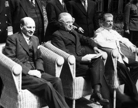 17 ביולי 1945 – גרמניה מחולקת (לארבע): החלה ועידת פוטסדם. את הועידה כינסו בעלות הברית בעיר הגרמנית פוטסדם לאחר כניעתה של גרמניה במלחמת העולם השנייה, במטרה לסכם על חלוקת השטחים באירופה שנכבשו במלחמה. בוועידה השתתפו נשיא ארה"ב, טרומן, ראש ממשלת בריטניה, קלמנט אטלי (בתחילה יוצגה בריטניה על ידי רה"מ צ'רציל שהפסיד בבחירות במהלך הועידה), ומנהיג ברה"מ, סטלין. סטלין היה גם הדמות הדומיננטית בוועידה. הוא היה היחיד מבין שלושת המנהיגים ששלט גם בימי המלחמה, ומשום כך, ובשל נוכחות הצבא הסובייטי במרכז אירופה, היתה ידו על העליונה בדיונים.