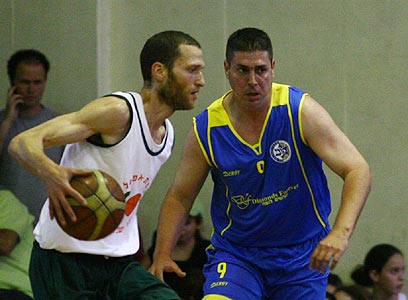 שפר מול אלון בן זקן במשחק ותיקים (צילום: אלי אלגרט)