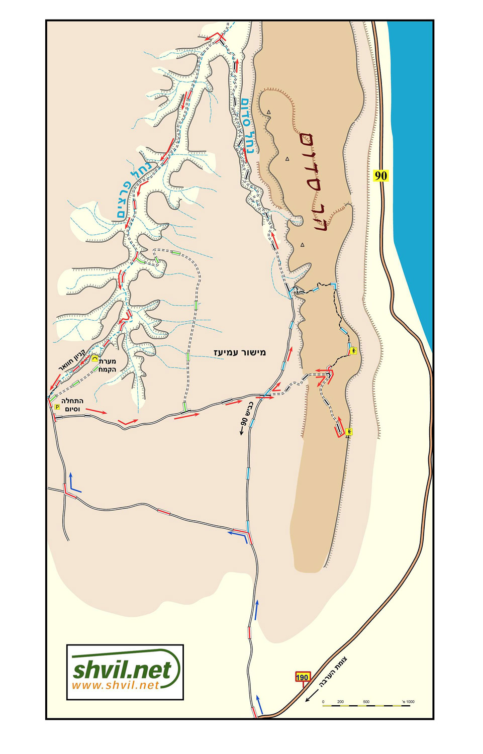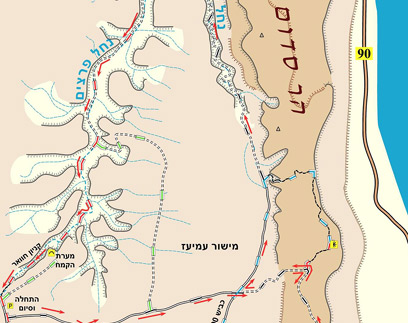 הערה: רוכבים המעוניינים להאריך את המסלול בעוד מספר קילומטרים ,יכולים להשאיר את הרכבים בחנייה של מפעלי ים המלח ולהתחיל משם את הטיול כשהם פונים תחילה אל השביל האדום על פי תאור הדרך הנ"ל.