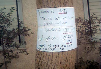 "נתנו שם לעצים שאנחנו חוששים לעתידם". המודעה (צילום: אריאל מריות)