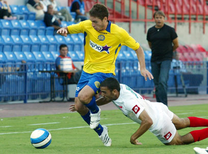 דן רומן מתקשה מול סכנין והיציעים הריקים (צילום: אלי אלגרט)