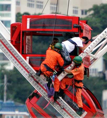 מנסים לחלץ את הנוסעים מהגלגל הענק התקוע, היום בבוסאן (צילום: AP)
