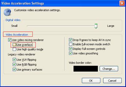 תחת Video Acceleration (האצת וידאו) יש לבטל את ה-V המסומן ליד "Use overlays" (השתמש בשכבות על).