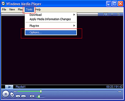 בשלב הראשון יש לפתוח את Windows Media Player (שיטה מזורזת: נכנסים להתחל, הפעלה, כותבים wmplayer ו-enter). נכנסים לתפריט Tools (ב-Windows בעברית - כלים) שבחלק העליון של החלון ומשם ל-Options (אפשרויות).