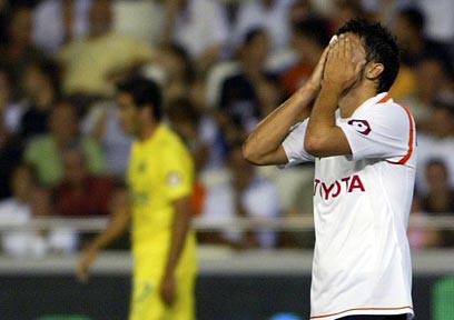 דויד וייה תופס את הראש אחרי ההרחקה נגד ויאריאל (צילום: רויטרס)